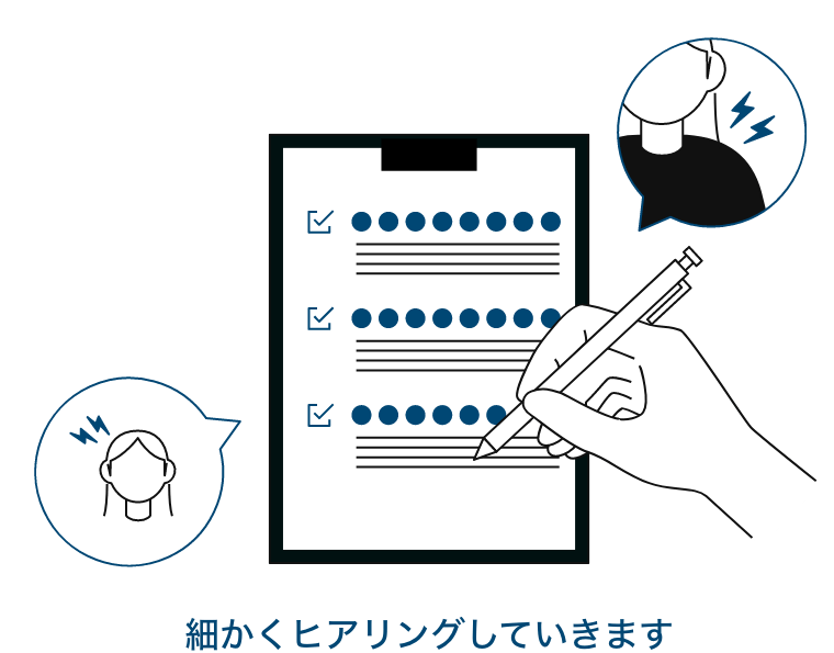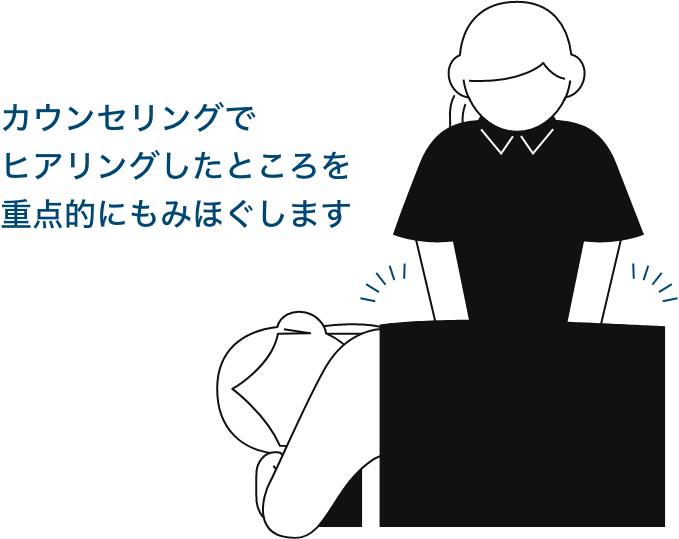 担当セラピストがお客様の体調やこり・疲れの部位をヒアリングいたします。重点的にもみほぐしたい箇所や、触れられたくない箇所などご要望をお伝えください。(アプリでは事前に登録することも可能です。)